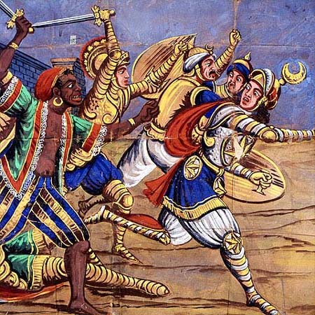 Cartellone dell'opera dei pupi Catanese dipinto da Francesco Vasta (Catania) 1920. - "Perì mette in fuga Zanclea" - Museo internazionale delle marionette Antonio Pasqualino. foto di Bazan
