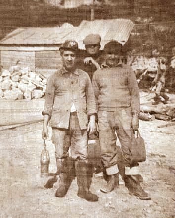 Comitini - Miniera Stretto Cuvello. Operai pronti a scendere nel sottosuolo. Uno di questi ha in mano la "Citolena" (che riempita di acetilene mista ad acqua si trasformava in gas). Serviva a fare luce all'interno della miniera.